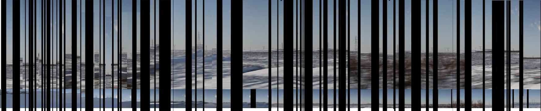 | One of the main reasons, if not the main one, leading to the "Anthropocene" era is the extensive commercialization of the natural resources, as it is happening through the absolutely unbalanced exploitation of nature, especially regarding the exploitation of the natural energy resources and the way they are subsequently consumed and recycled. Audiovisual material is projected on hanged thermal papers creating series of parallel vertical images that resemble a spatial bar-code and imply the conversion of the projected landscapes in consumption products. (http://vasileiosbouzas.artroom7.com/dismemberedlands/). The audiovisual material consists of non-linear narratives recorded during wanderings in various landscapes, where the signs of industrialization and commercialization are quite visible, animated texts which consist of parts of statements on cases of destruction of natural resources and recorded communications concerning a possible disaster, and finally map collages of various industrialized areas. The audio of the installation consists of a synthesis of natural sounds (air and water), sounds of industrial sites and typing processes, creating allegorical readings of the visual material. | |